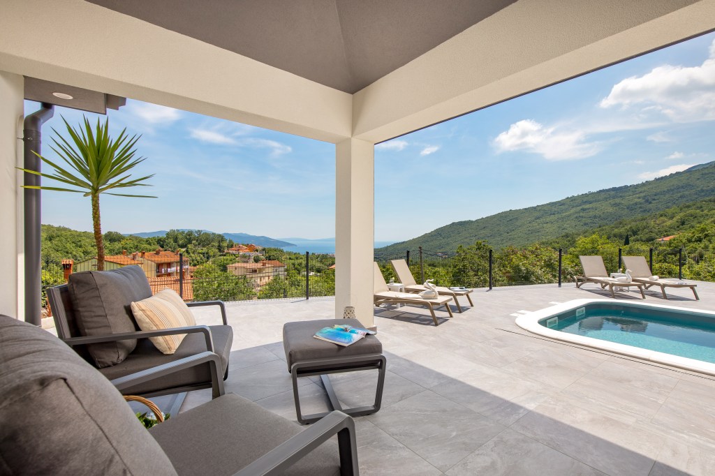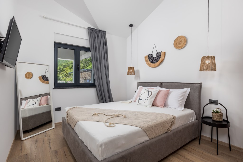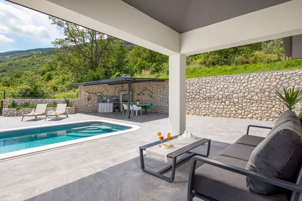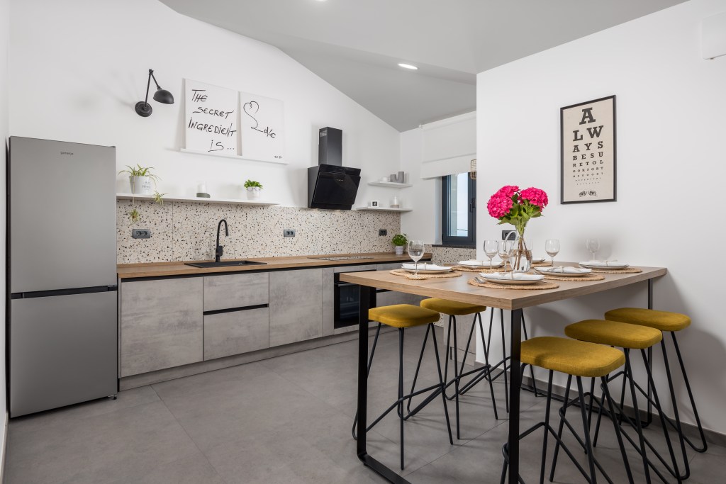 At the time of the building, there was a period when huge amounts of praying mantises gathered at the front door. Surely, they are classified as predators or cannibals, but among ancient beliefs, they are also a sign of good luck or that they can show lost travelers the way home… Intrigued by this insect, I have decided to dedicate their name to this project. Beautiful and unique as it is a praying mantis. Villa Mantis is where modern meets the rubbish (collected and refurbished by me), where grey hugs bright colors, where art meets the regular and things become pieces to look at. The villa offers accommodation for 6 people. It has 3 bedrooms and 3 bathrooms. Large living space with modern kitchen. The outdoor area has a swimming pool and kitchen with barbeque. Large sunbathing area with a beautiful view of Island Cres and Kvarner Bay.